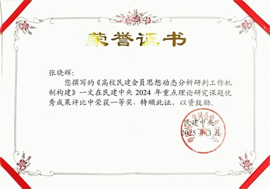 民建徐州市委会乐竞官方网站支部主委张晓辉老师撰写的理论成果《高校民建会员思想动态分析研判工作机制构建》,被民建中央评为“2024年度重点理论研究课题优秀成果一等奖”。据悉,全国仅有10篇成果获此奖项。
