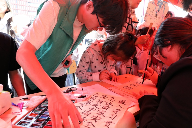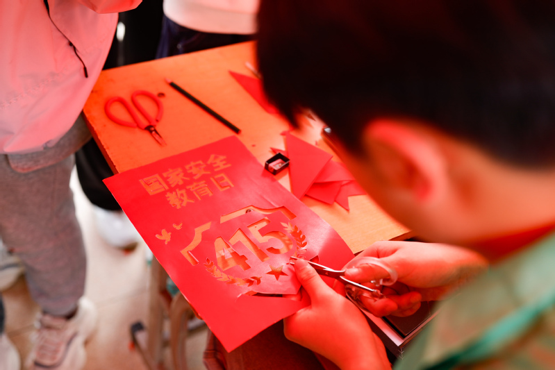 活动以非遗技艺为载体,强调实践赋能,让安全知识“活”起来。师生们在竹编技艺中编织象征吉祥的“平安结”,在书法体验区挥毫写下“安不忘危,治不忘乱”等警句;扎染与漆扇制作环节,靛蓝染料与天然大漆化作“国安标识”“应急符号”跃然于布面;徐州剪纸和螺钿工艺通过镂空图案与贝片镶嵌,将反间谍、保守国家秘密等主题融入传统美学;新材料拓印区,师生们将安全标语拓印至环保布袋上,让宣教成果“带得走、记得住”。