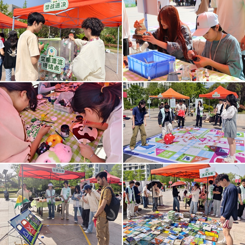 “创意互动区”通过“环保飞行棋”知识闯关、“垃圾分类沙包投掷”等活动让同学们在轻松愉快的氛围中学习环保知识,解锁环保新玩法。标本书签制作、手绘帆布包、古法造纸、植物拓染、扎染等活动也吸引了众多师生参与。市集还设置了“空瓶漂流终结点”与“资源循环枢纽站”,鼓励师生资源循环利用。