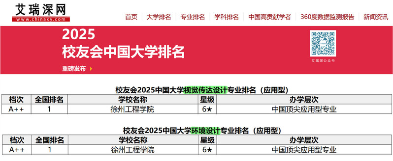 日前,全国第三方大学评价研究机构艾瑞深校友会网发布了《校友会2025中国大学专业排名(应用型)》。设计学院视觉传达设计、环境设计2个专业荣登榜首,荣获2025中国六星级应用型专业。