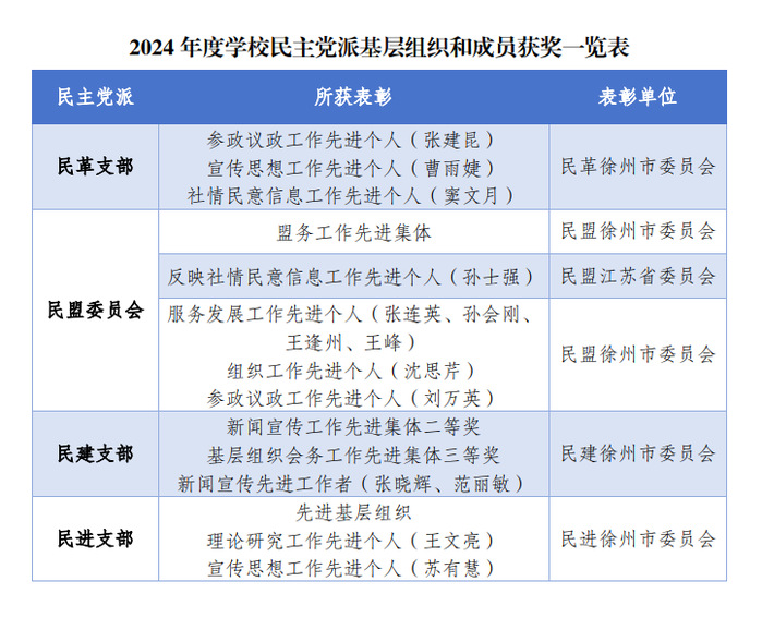 近日,在各民主党派市级及以上委员会组织的2024年度评选表彰活动中,我校民主党派基层组织和成员在参政议政、社会服务等方面表现突出,荣获集体表彰4项、个人表彰14项,展现了学校统一战线良好风貌。