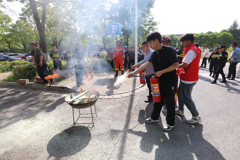 启动仪式后,大龙湖旅游度假区消防救援大队在土木工程学院智能建造实验室组织师生、安保人员、实验员、后勤保障人员等开展了应急演练。消防队员还演示了移动式水泵车及各类灭火器械的用途和使用方法,并指导现场师生开展了灭火操作实践。