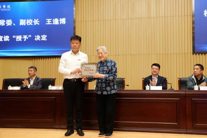 刘洋书记向朱新兰教授颁发捐赠证书、教育贡献奖牌