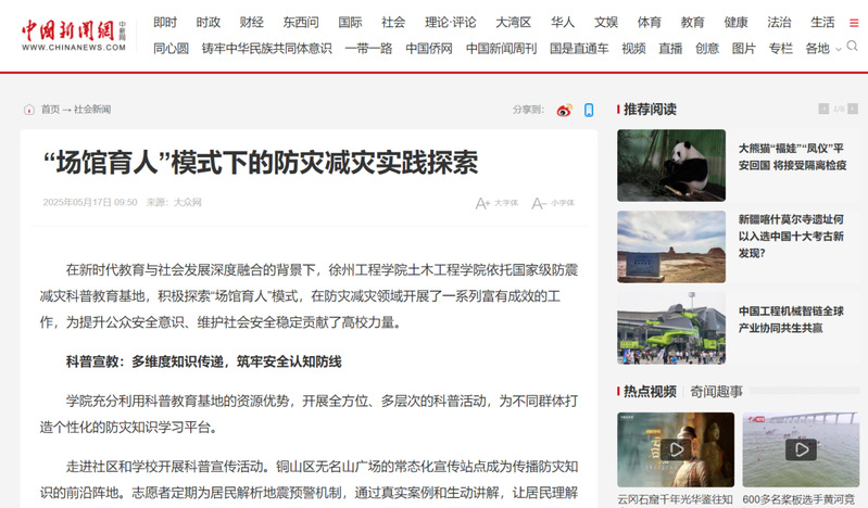 近日,我校土木工程学院依托国家防震减灾科普教育基地积极探索“场馆育人”模式,获新华网、中国新闻网深度报道。报道聚焦土木学院在科普宣教、安全实训、校地协同等领域的实践,充分肯定了学院将专业教育与社会责任深度融合的做法。