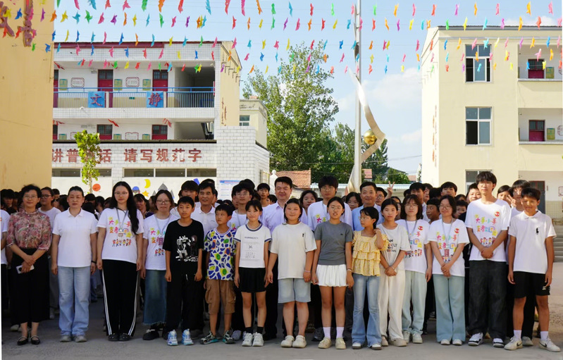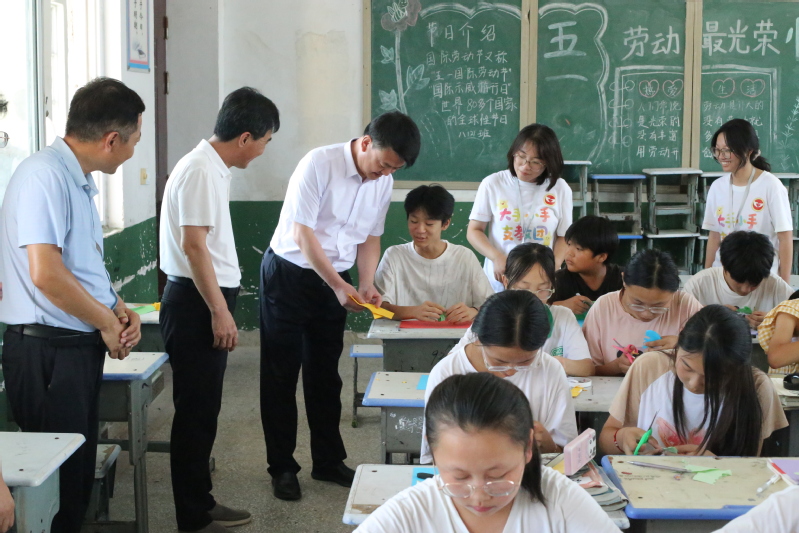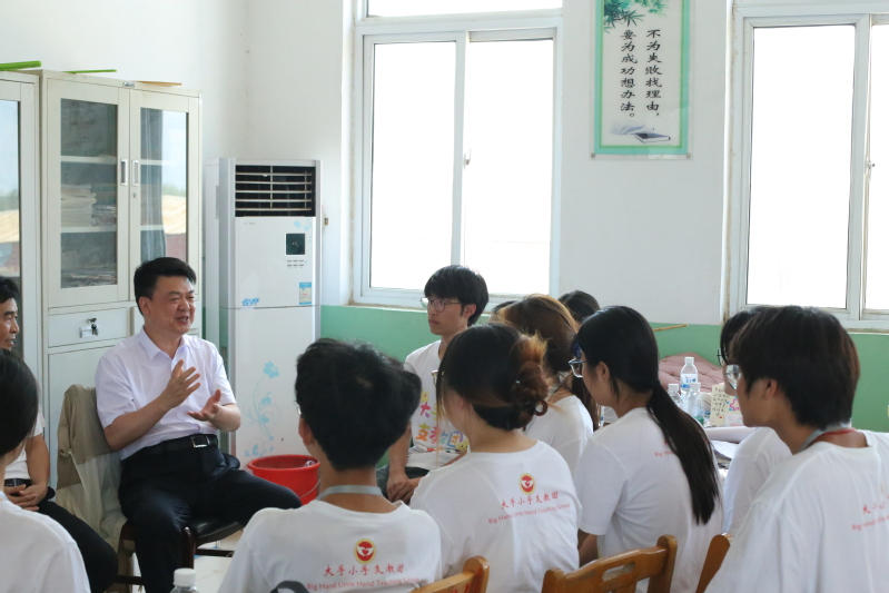 刘洋一行来到商丘市虞城县小侯中学,亲切看望慰问在当地参加暑期社会实践活动的“我校第11届大手小手支教”团队。他们参观了校园环境,走进了教学课堂,详细了解了支教团学生的工作生活情况,并向支教团成员和小侯中学学生赠送了生活和学习用品等。