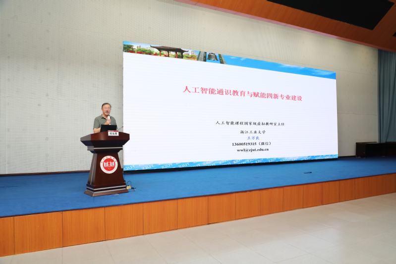 在专家报告环节,国家级教学名师、浙江工业大学教授王万良作了题为《人工智能通识教育与赋能“四新”专业建设》的报告,为我校人工智能通识教育体系建设提供了理论指导和实践范例。山东农业大学教授冯竟竟以《冲击与重塑:迈向AI驱动的“教-学-管-评”四位一体教育新生态》为题,分享了建设理念与实践经验。
