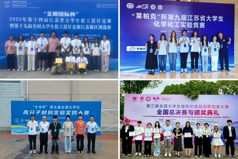 在第十九届全国大学生化工设计竞赛中,张丽娟、郭中玉、蒋劲松、董茜、朱婧等同学在石春玲、连露露、韩燕玲、周俊等老师悉心指导下,荣获全国三等奖7项;华东区二等奖2项、三等奖5项;江苏省特等奖1项、一等奖3项、二等奖13项。在第八届全国大学生化工实验大赛华东区赛中,陈芝威、张圣武、史定川团队获仿真单项奖(指导教师:葛奉娟)。