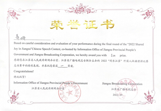 近日,由教育部、国家语委主办的第四届中华经典诵写讲“诵读中国”全国大赛落下帷幕,我校留学生在大赛中表现出色。学生作品《读中国》《我爱你,中国》分别获得留学生组二等奖和三等奖,为2022年该项赛事江苏高校留学生赛道所获最高奖项。在由江苏省人民政府新闻办公室、江苏省人民政府外事办公室、江苏省教育厅等单位共同主办的2022“同乐江苏”外国人汉语演讲比赛中,我校留学生荣获总决赛一等奖和三等奖。自中华经典诵写讲“诵读中国”“同乐江苏”系列比赛启动以来,我校国际教育学院师生积极备赛,精心打磨比赛作品,获得评审专家一致好评。