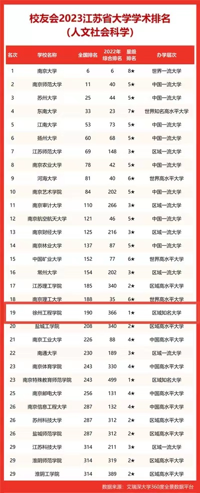 日前,第三方大学评价机构艾瑞深校友会网最新公布校友会2023中国大学学术排名和2023中国大学科研成果排名,我校“人文社会科学”排名取得新突破,进入全国高校200强,位列全国高校第190位,江苏高校第19位。
