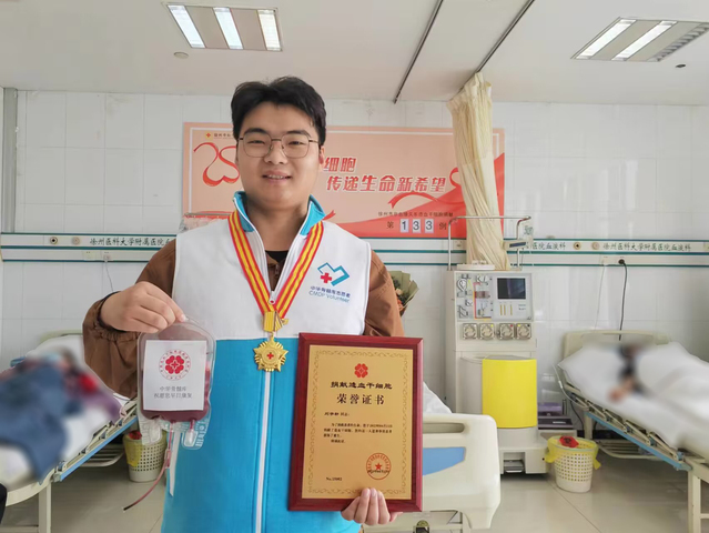 4月11日上午,徐州医科大学附属医院核细胞采集室,一位造血干细胞志愿者正在为远方素不相识的血液患者点燃生命的火种。这名志愿者叫刘宇轩,是我校材料与化学工程学院19高分子班的学生。