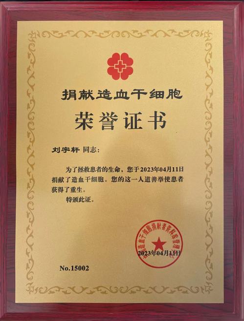 刘宇轩同学在校期间热心公益,组织参加过多次公益募捐、志愿服务及献血活动。2021年在一次献血时,经工作人员宣传介绍,他义无反顾地加入了中华骨髓库,成为一名造血干细胞志愿捐献者。2022年12月,当得知他与一名白血病患者骨髓配型成功,被问询是否同意捐献时,刘宇轩毫不犹豫地作出了肯定回答。得知刘宇轩的决定后,家人和学院对刘宇轩这一义举十分支持。在此期间,刘宇轩注意饮食、锻炼身体,确保高分辨分型全相合、体检合格,为捐献造血干细胞做好充分准备工作。