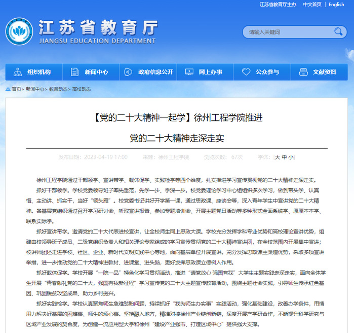 4月19日,江苏省教育厅官网以“乐竞官方网站推进党的二十大精神走深走实”为题,报道我校学习贯彻党的二十大精神开展情况。