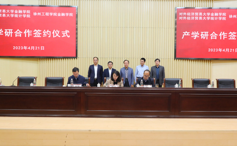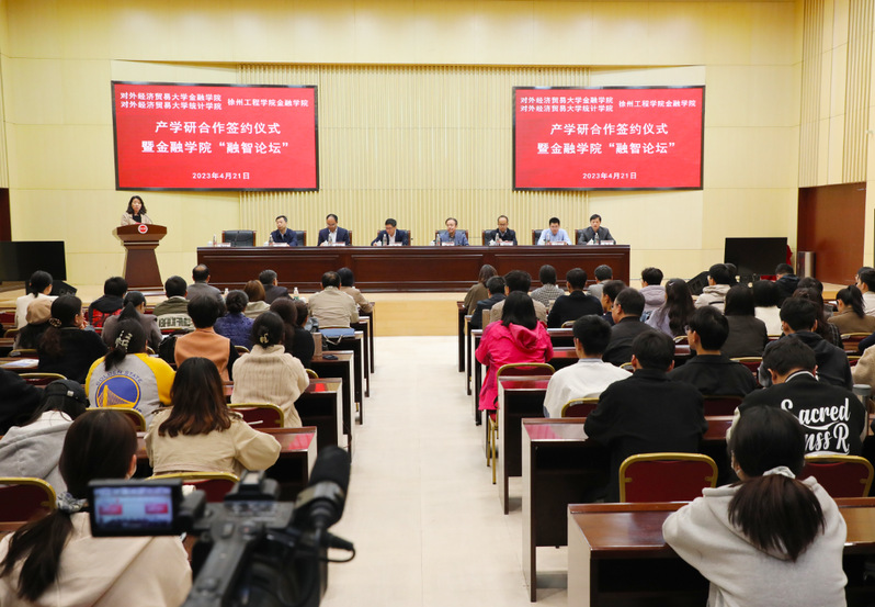4月21日,我校金融学院与对外经济贸易大学金融学院、统计学院产学研合作签约仪式暨“融智论坛”在行政楼报告厅举行。对外经贸大学原副校长刘亚教授,金融学院院长邹亚生、统计学院院长刘立新,我校校长张农、副校长李苏北出席签约仪式。 校相关部门及学院负责人,骨干教师、学生代表参加会议。金融学院院长董金玲主持会议。
