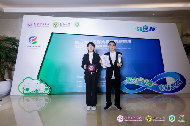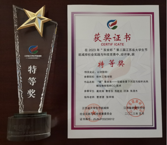 近日,由南京理工大学、东南大学与江苏省能源研究会主办的“双良杯”第三届江苏省大学生节能减排社会实践与科技竞赛决赛在南京落下帷幕,经过激烈的分组答辩和现场作品展示评审,我校环境工程学院戴欢涛、曹苓玉等同学的作品“碳索未来——双碳背景下污泥与秸秆共热解生物炭吸附CO2技术”荣获特等奖,我校荣获优秀组织奖。本届竞赛共有51所省内高校参赛,收到有效参赛作品1474件。我校环境工程学院、物理与新能源学院组织的四支参赛队伍在决赛中凭借扎实的专业功底、优异的现场表现,最终获得了特等奖1项、二等奖3项的好成绩。