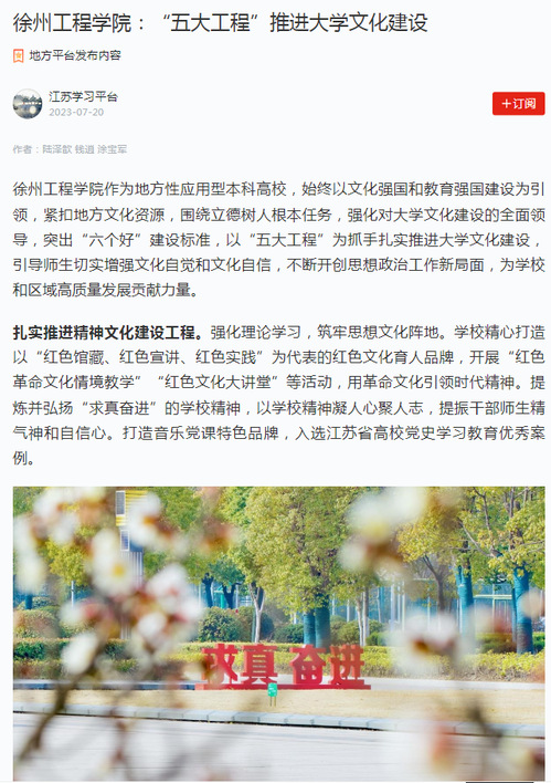 7月20日,学习强国江苏平台从精神文化建设工程、环境文化建设工程、行为文化建设工程、制度文化建设工程和网络文化建设工程五个方面聚焦我校大学文化建设。现全文转载,以飨读者。