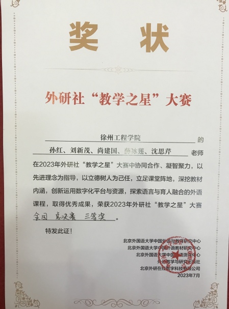 近日, 2023年外研社全国高校外语教师“教学之星”大赛在陕西西安落下帷幕。我校外国语学院孙红、刘新茂等老师组成的教学团队荣获全国总决赛三等奖,创外国语学院教学比赛历史最好成绩。