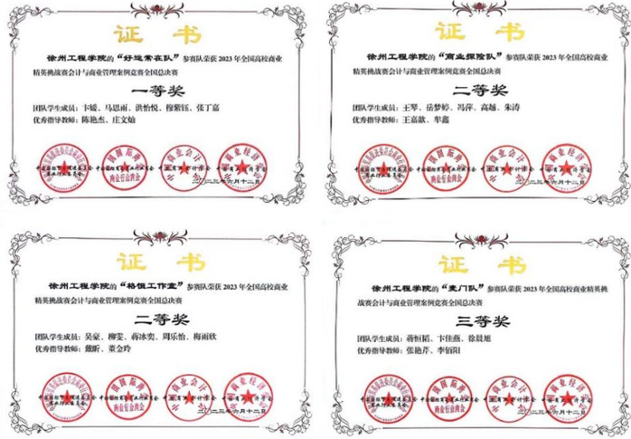 在2023年全国高校商业精英挑战赛会计与商业管理案例竞赛中,由陈艳杰、戴昕等老师指导的4支队伍与来自全国各地400余所院校的1100余支参赛队同台比拼,荣获一等奖1项、二等奖2项、三等奖1项。在第九届东方财富杯全国大学生金融挑战赛中,共荣获全国三等奖1项,江苏省一等奖2项、江苏省二等奖2项、三等奖12项。在2023年第十届全国证券投资模拟实训大赛中,荣获全国铜奖2项、全国一等奖8项、全国二等奖13项、全国三等奖6项。在2023年第六届全国高校经济决策虚仿实验大赛中,由何颖、陈彦华等老师指导的7支代表队,荣获国家一等奖5项、二等奖2项。