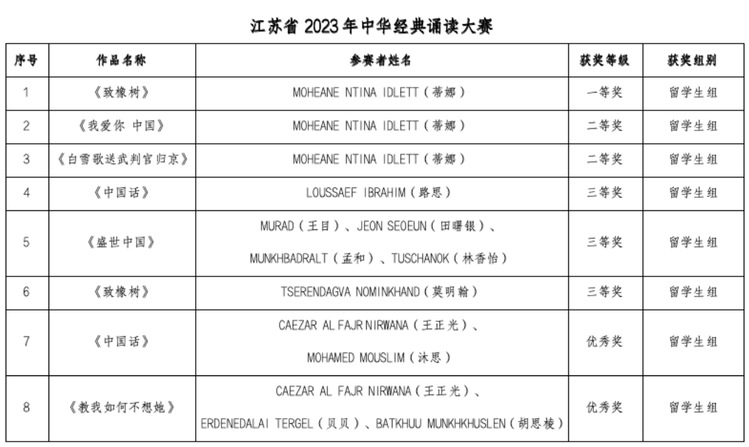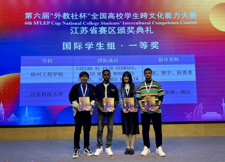 近日,第六届“外教社杯”跨文化能力大赛江苏省总决赛在常州大学落下帷幕。我校留学生王正光、王目、沐思组成的团队首次参赛,荣获江苏赛区国际学生组一等奖。在江苏省教育厅、省文明办、省文旅厅、省新闻出版局、省全民阅读办联合举办的2023年度中华诵写讲系列比赛中,我校留学生获奖8项,其中一等奖1项,二等奖2项。(国际教育学院)