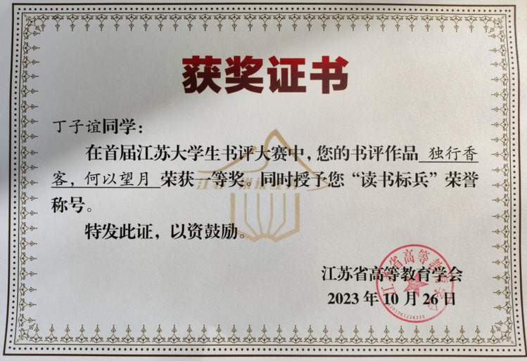近日,从江苏省高等教育学会获悉,我校学生作品在首届江苏大学生书评大赛荣获一等奖2项,二等奖1项,3名学生荣获“读书标兵”。据悉,全省50所高校申报的278个作品中,共评选出特等奖10个,一等奖44个,二等奖146个;我校3名学生作品获奖,获奖学生同时被评为“读书标兵”。(学工处)