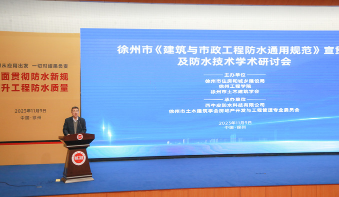 为做好我市建筑与市政工程渗漏质量通病防治工作,提高建筑管理相关各方的技术管理水平, 11月9日下午,徐州市《建筑与市政工程防水通用规范》宣贯及防水技术研讨会在我校逸夫图书馆报告厅举行。副校长黄传辉,市土木建筑学会理事长朱步,新盛集团副总经理王善龙出席会议并致辞。市住建局工程质量安全监管处处长刘世春主持会议。