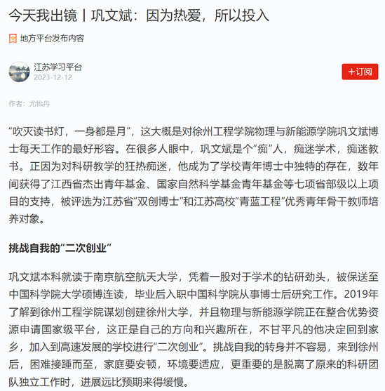 12月12日,学习强国江苏平台报道了我校物理与新能源学院巩文斌博士教学科研先进事迹。