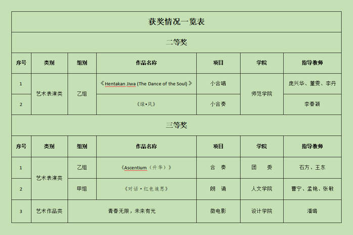 近日,江苏省教育厅公布了第七届大学生艺术展演活动获奖情况,我校参加部分展演类别,并获二等奖2项、三等奖3项,4人获优秀指导教师奖。