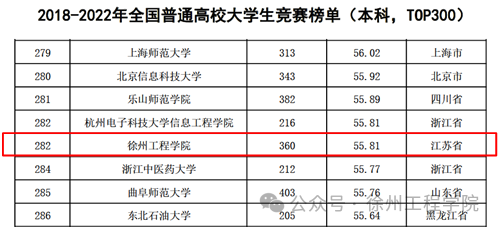 (1)中国高等教育学会官方平台发布《2022年全国普通高校大学生竞赛分析报告》。我校大学生学科竞赛工作再上新台阶,位列2018-2022年全国普通高校大学生竞赛榜单(本科,TOP300)282位,同时位列全国普通高校大学生竞赛第七轮总榜单(本科,TOP300)289位,双双进入本科高校300强。此外,我校还位列2018-2022年全国新建本科院校大学生竞赛榜单(TOP100)34位,省内排名第4。