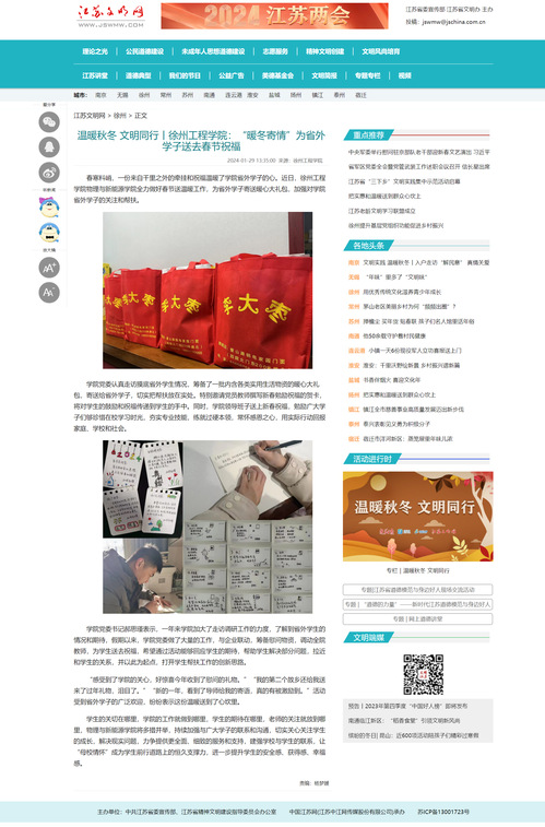 近日,江苏文明网报道我校物理与新能源学院在春节前夕为省外学子“暖冬寄情”。