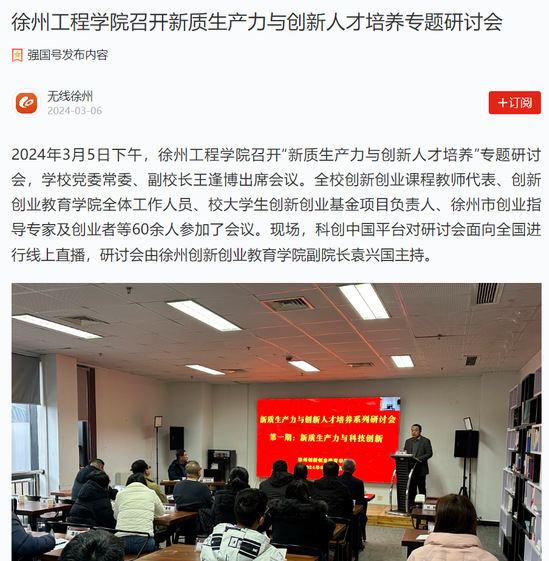 3月6日,学习强国“无线徐州”强国号以“乐竞官方网站召开新质生产力与创新人才培养专题研讨会”为题聚焦我校学习贯彻2024两会精神的工作作法。