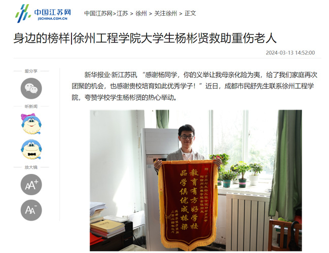 3月13日,中国江苏网以“身边的榜样|乐竞官方网站大学生杨彬贤救助重伤老人”为题,报道我校食品与生物工程学院杨彬贤的先进事迹。