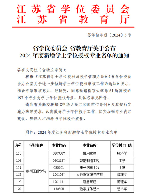 近日,江苏省学位委员会、江苏省教育厅公布了《2024年度新增学士学位授权专业名单的通知》(苏学位字函〔2024〕3号),同意我校新增学士学位授权专业6个。