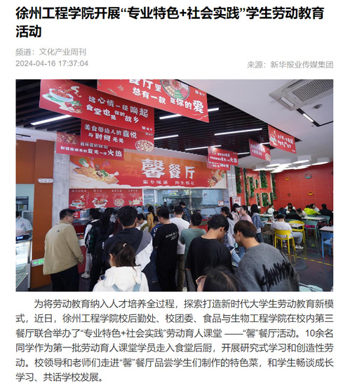 由我校后勤处、校团委、食品与生物工程学院在校内第三餐厅联合举办了“专业特色+社会实践”劳动育人课堂 ——“馨”餐厅活动,4月16日被交汇点新闻关注并报道。