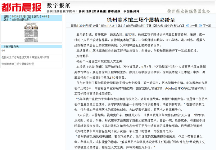 5月10日,《都市晨报》以“徐州美术馆三场个展精彩纷呈”为题,报道我校设计学院三位教师佟彤、张超、庞一村的个人艺术设计作品展。