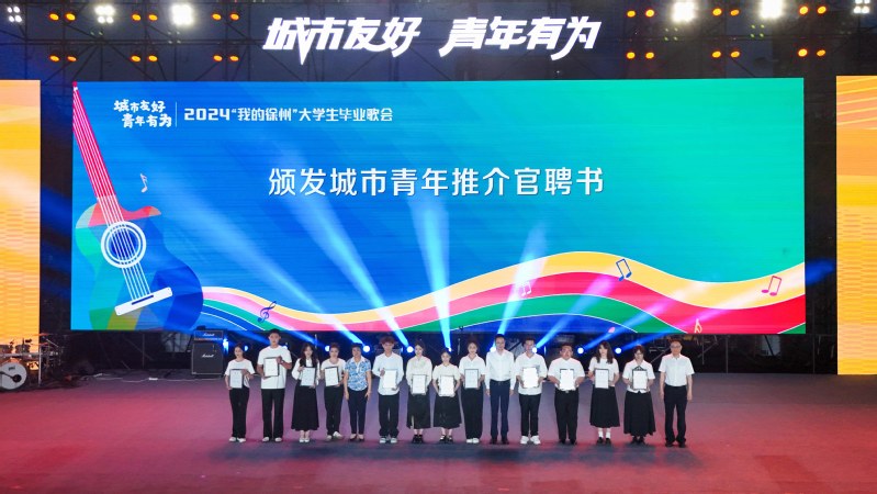 共青团江苏省委副书记张永意、徐州市人大常委会副主任李燕、徐州市政协党组成员孙光永共同上台,为12位驻徐高校城市青年推介官代表颁发聘书。