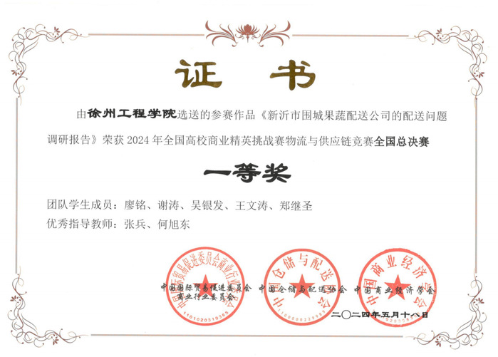 近日,2024年全国高校商业精英挑战赛物流与供应链竞赛全国总决赛成绩揭晓。我校管理工程学院学生组成的三支参赛队,在决赛中表现优异,分别斩获全国一等奖、二等奖、三等奖各1项。张兵老师被评为优秀指导教师。