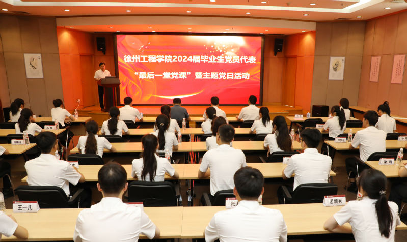 为进一步加强毕业生党员教育,引导毕业生党员在学思践悟中坚定理想信念,在实干担当中锤炼党性修养,推进党纪学习教育走深走实,6月18日上午,我校举行2024届毕业生党员代表“最后一堂党课”暨主题党日活动。校党委书记刘洋出席活动并为毕业生党员代表讲授党课。淮海战役烈士纪念塔管理中心主任贾萍、徐州博物馆馆长李晓军,我校党委常委、组织部部长涂宝军、金融学院党委书记李浩、信息工程学院党委副书记朱淼及2024届毕业生党员代表参加活动。