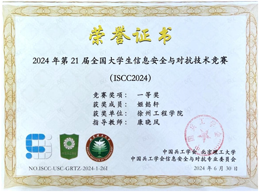 近日,由北京理工大学主办的2024年第21届信息安全与对抗技术竞赛(ISCC 2024)获奖名单正式公布,我校学子在本次大赛中表现优异,在个人挑战赛(大学生赛区)中姬懿轩同学荣获国家一等奖,何培延等5位同学获国家二等奖,王宇等9位同学获国家三等奖。本届竞赛的个人挑战赛于2024年5月1日至25日举行,吸引了来自全国2000多所学校及企事业单位的13400余人报名参赛,赛区涵盖大学生赛区、研究生赛区、中小学生赛区等多个组别。