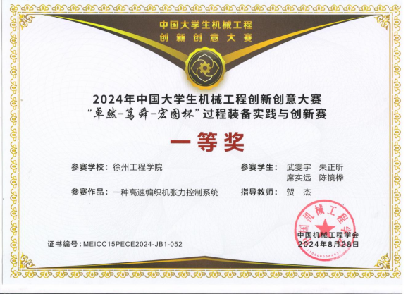 中国大学生机械工程创新创意大赛,由中国机械工程学会主办,自2024年4月征集参赛作品以来,赛事共收到来自全国171所高校的2965个团队报名参赛,《一种高速编织机张力控制系统》项目经学校推荐参加区域赛比赛。区域赛中获江苏赛区一等奖晋级国赛,与全国10个区域(省区)赛推选的600项作品(其中本科生作品453项,研究生作品147项)同台较量。