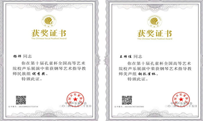 近日,由中国声乐家协会主办的“第十届孔雀杯高等艺术院校声乐展演暨第八届高校声乐学术交流活动”在广州圆满落下帷幕。大赛旨在推动全国高等艺术院校声乐艺术的发展与交流,包括高校声乐学术交流、声乐学术论文征集、公开课及学术讲座等。本届活动吸引了全国300余所高校的3700余名选手参赛,竞争激烈,精彩纷呈。我校师范学院师生凭借深厚的艺术底蕴、扎实的专业功底和精湛的演唱技巧,他们的精彩表现赢得了评委和观众的赞誉。其中,杨烨老师荣获“铜孔雀杯”及优秀奖各一项;王玮佳老师荣获“铜孔雀杯”一项;学生陈太睿获得参与奖。