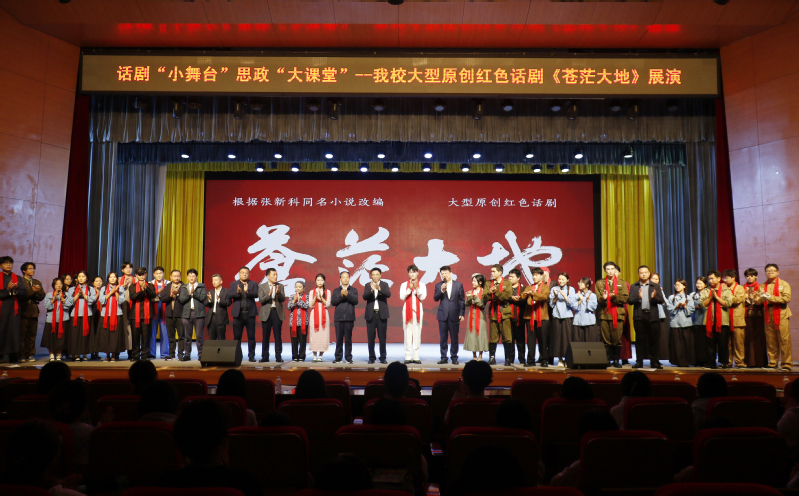 近日,由同名长篇小说改编的新版话剧《苍茫大地》在我校学生剧场上演。江苏省社科联党组书记、常务副主席张新科,我校党委书记刘洋出席活动。省市社科联及在徐高校相关负责人、我校有关部门及学生代表500人现场观看了话剧演出。
