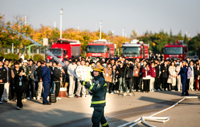 11月6日下午,我校联合徐州市云龙区消防大队开展消防安全主题活动。电控学院承办此次活动。副校长王逢博,徐州市消防救援支队副支队长姜浩,徐州市云龙区消防救援大队大队长薛伟,徐州市云龙区大龙湖旅游度假区消防救援大队大队长樊飞,校学工处、保卫处及电控学院负责人出席活动开幕式,全校1000余名师生参加活动。在消防安全讲座中,“千名消防讲师进万家”活动讲师、大龙湖旅游度假区消防救援大队张萌警官详细介绍了校园消防、家庭防火等基础知识,以及火灾逃生与自救方法,为师生呈现了一堂生动的消防安全教育课。在消防安全知识宣传和消防演练现场,大龙湖旅游度假区消防救援大队消防员向师生展示了常用消防设备,介绍了常用消防设备的使用方法,演示了油锅起火扑救、其他火情处理、灭火器使用方法、切割灯泡等。教师和学生安全员开展了实际操作演练。现场还设置了有奖问答环节,师生在互动中进一步掌握了安全知识和技能。