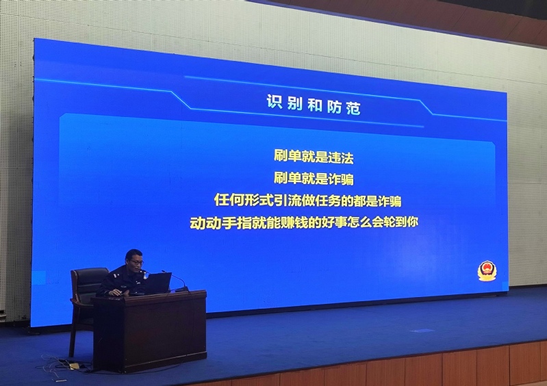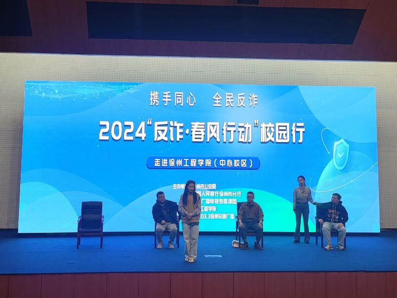 为增强广大师生的反诈意识和防范能力,近日,由徐州市公安局、中国人民银行徐州市分行、徐州广播电视传媒集团主办,我校协办的2024“反诈·春风行动”校园行活动在图书馆报告厅举办。主持人首先介绍了反诈宣传教育的意义。通过宣传教育,使更多的人了解反诈知识,提高公众防范意识,增强自我保护能力,减少财产损失,保护人民群众的财产安全,共同维护学校的安全和稳定。本次活动内涵丰富、形式新颖。讲座环节,警官们为与会师生分享了常见的诈骗案例,深度讲解了电信网络诈骗的常见类型、识别方法及应对策略。徐州交通广播的工作人员以生动有趣的反诈小品,让在场的师生在欢笑中学习到防骗知识,提高师生的反诈意识和识诈能力。徐州市金融系统的工作人员与同学们开展答题互动,同学们踊跃参与、积极互动,在互动中加深对反诈骗知识的理解和记忆,同时领取精美的反诈骗宣传品,将安全意识带回家。