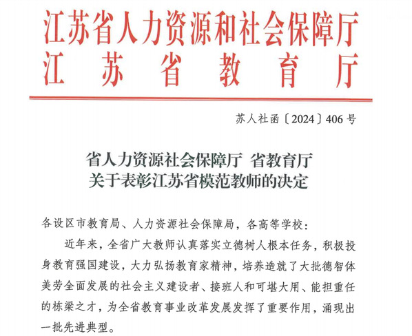 “江苏省模范教师”是经江苏省功勋荣誉表彰工作领导小组同意,省人力资源和社会保障厅、省教育厅组织开展的评选表彰活动。经层层选拔、审核和公示等相关程序,全省共150名教师被授予江苏省模范教师称号,全省高校仅20名教师当选。