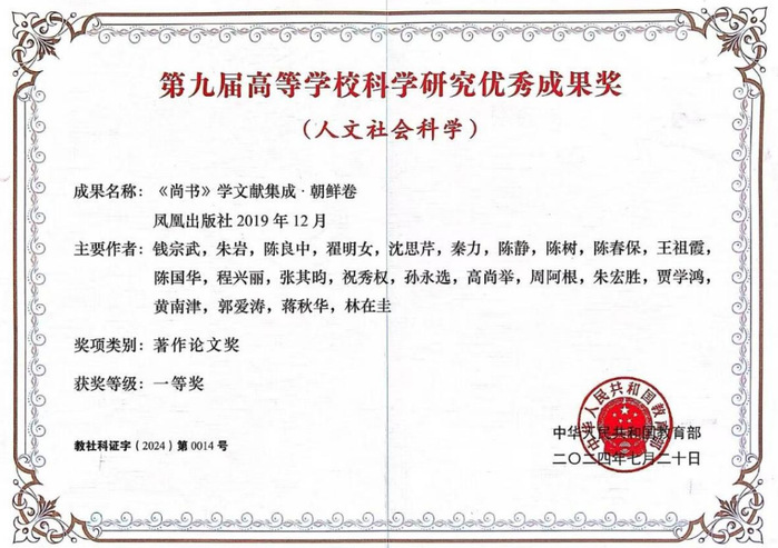 沈思芹副教授长期致力于《尚书》学研究,是扬州大学《尚书》学研究团队主要成员之一,也是本奖项主要完成人之一。《〈尚书〉学文献集成·朝鲜卷》辑录的是朝鲜时代学者用汉文撰写的《尚书》学文献,其中著作33部,单篇文章104篇,诗歌23首,涵盖了大约从公元14世纪中期至19世纪中期朝鲜学者研究《尚书》学的相关文献。