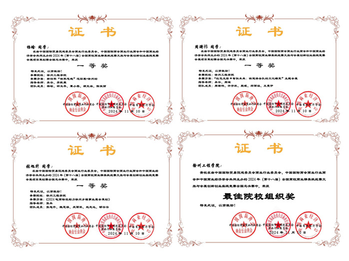 我校人文学院学生作品《新四军“铁军忠魂”巡回展▪徐州站》《“红色光影·智驭未来:铁道游击队的文化蝶变”主题会展》与管理工程学院学生作品《电商物流助力徐州乡镇事业展会策划》均荣获一等奖,人文学院学生作品《“非”昔味不可溯,“遗”今馔品新香——徐州非遗美食文化展》荣获三等奖,人文学院吴云、苏凯霖、周瑄、葛明与管理工程学院张兵老师荣获“最佳指导教师奖”,我校荣获“最佳院校组织奖”。